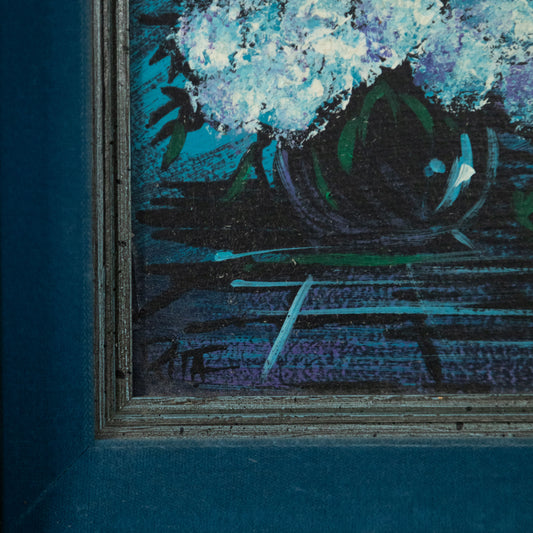 “Blue Mum Still Life” Vintage Oil Board Painting, Vase of Blue Flowers and Mums, Framed