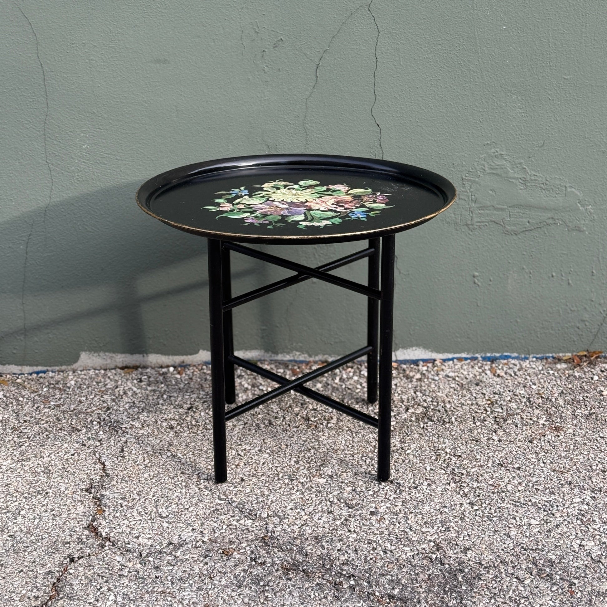 19th century hand-painted tray with folding stand. 22' round x 19"H