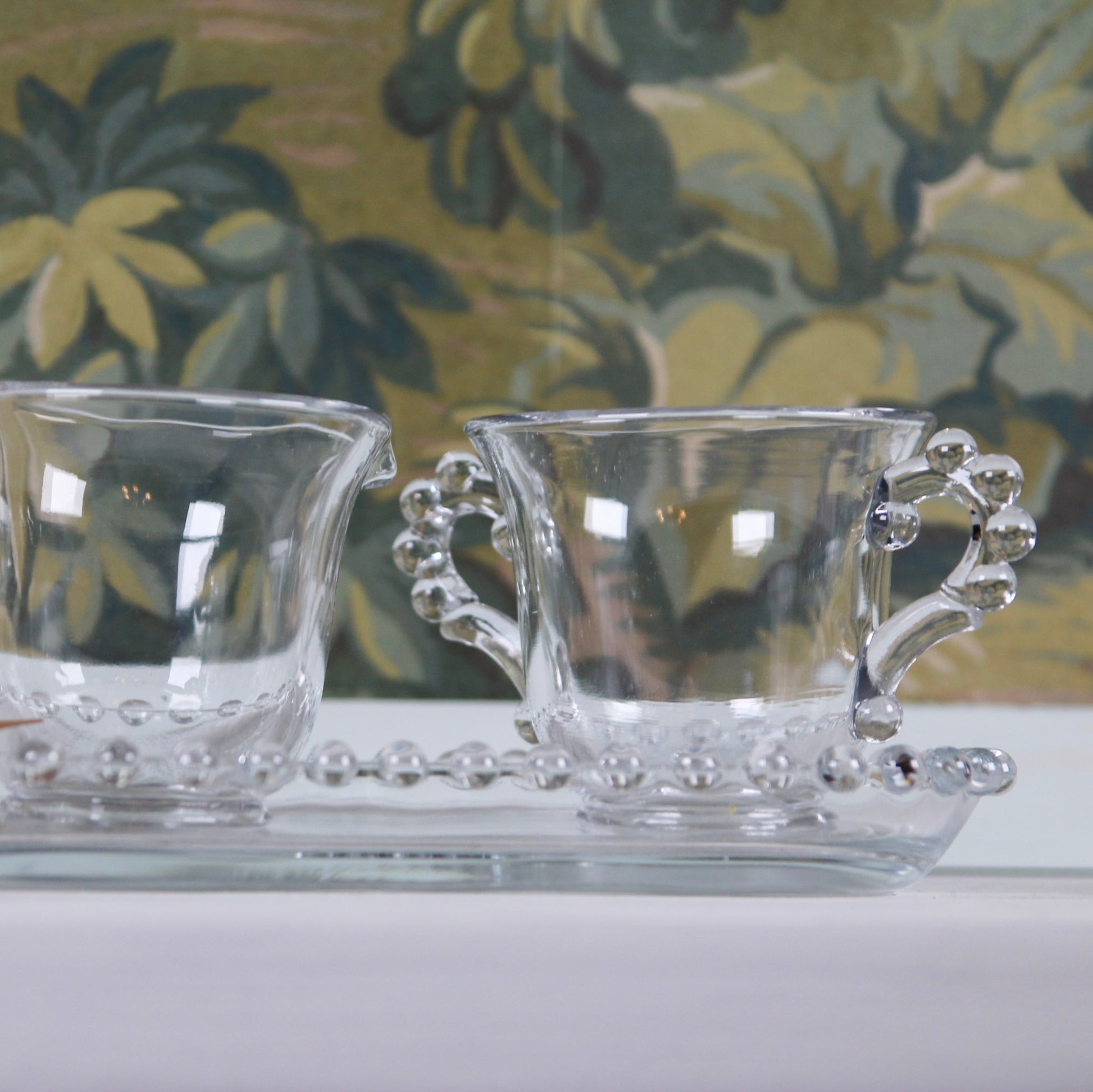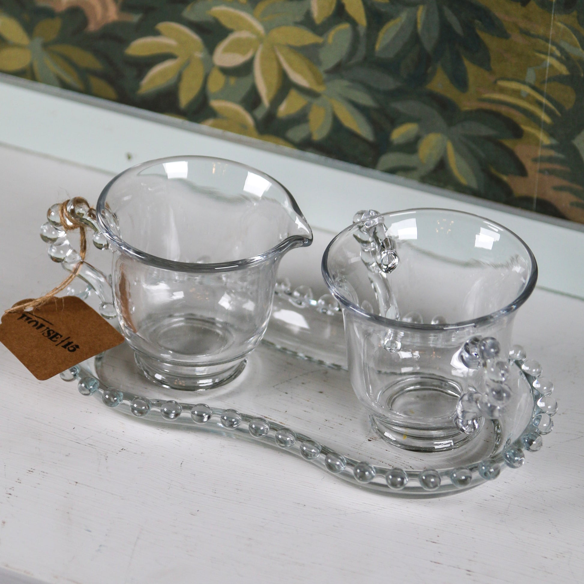 Textured glass with vintage charm, complete with a petite tray for easy serving. Great to use as cotton swab or bobby pin holder for your vanity or bathroom. 7 x 2.5-inch