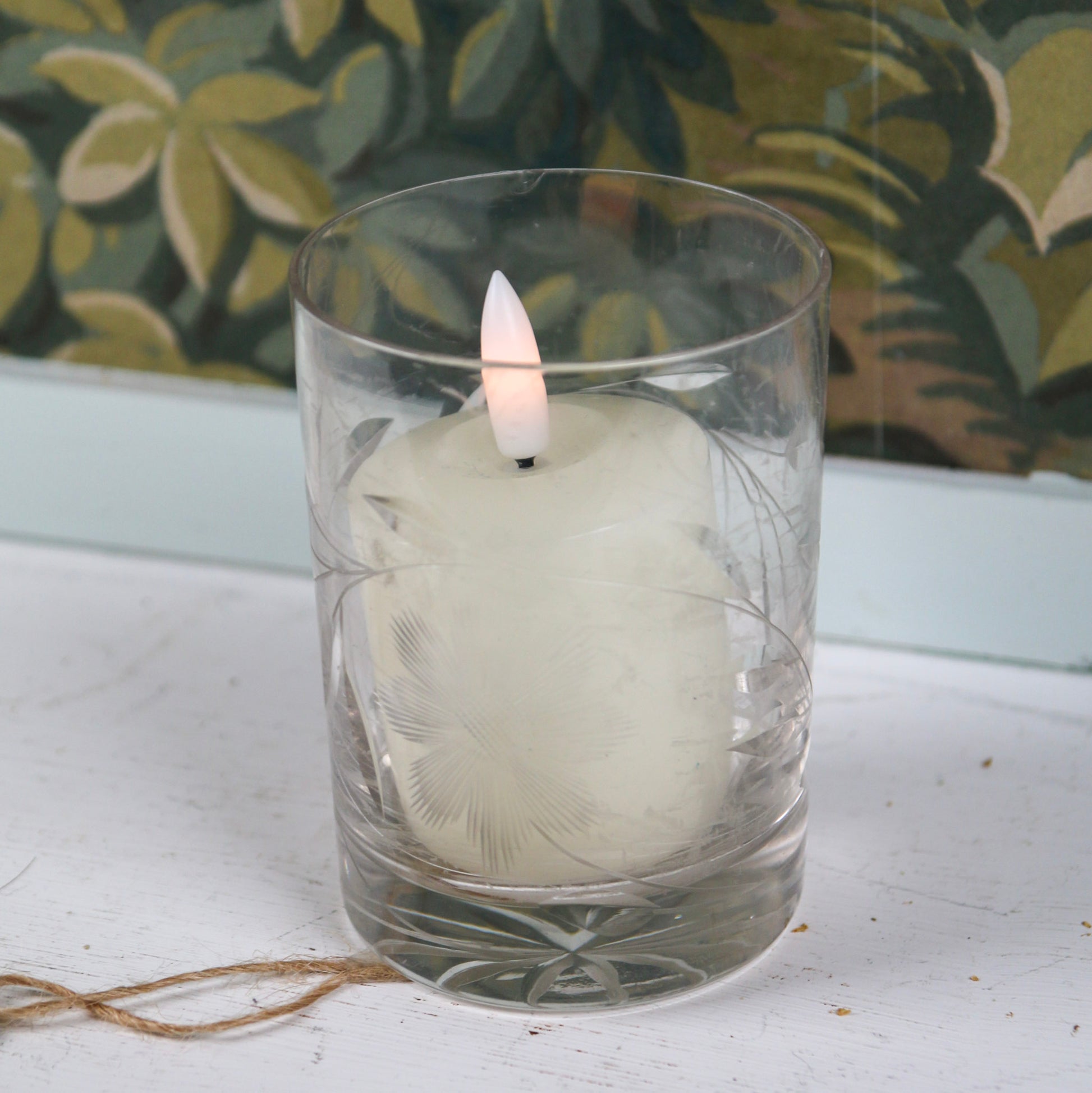 A petite glass cup with delicate floral etching, perfect for holding toothbrushes and small blooms or using as a candle holder. Measures 3.5x2.5 inches.