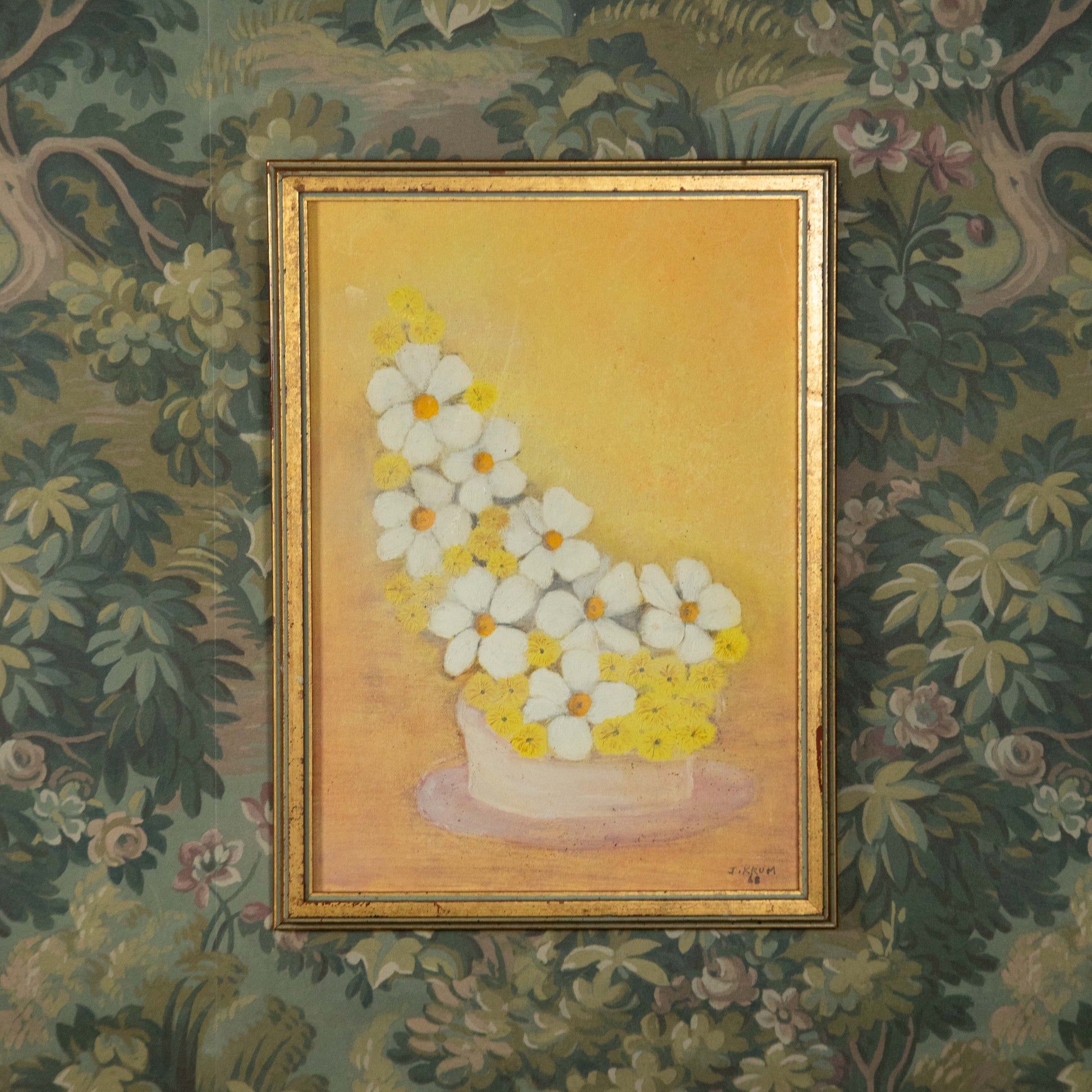 Mid century floral still life painted in oil on canvas board with a light, airy palette. Signed J. Krum and dated 1968, set in a gilt frame. Measures 15x11-inch.