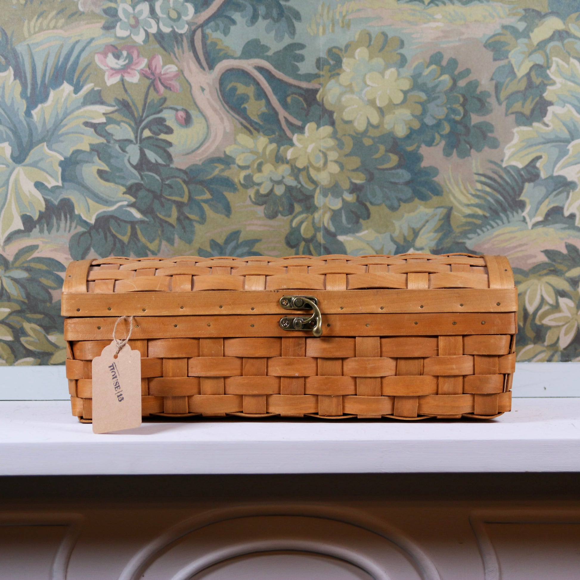 A handwoven oblong basket ideal for holding fruit, napkins, or bathroom essentials. Measures 13x5 inches.