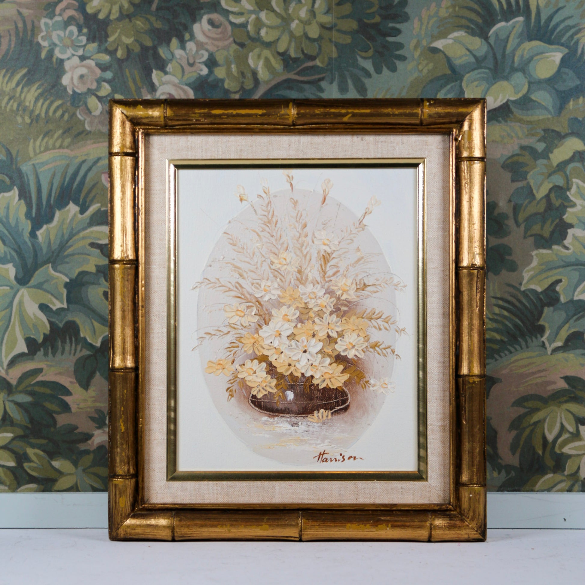 A hand-painted floral piece with soft color tones and vintage character. Measures 14x12 inches.