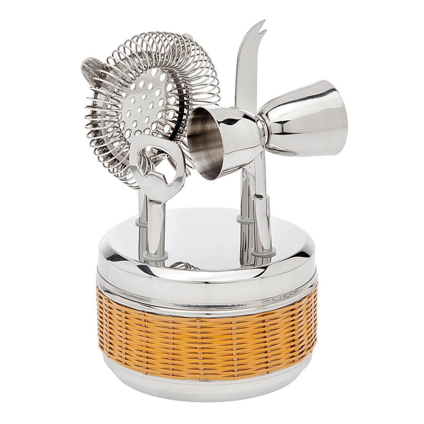 This five-piece bar set combines polished stainless steel with hand-wrapped rattan handles for a stylish blend of form and function. Perfect for mixing cocktails at home, the set includes all the essentials to elevate your bar cart or entertaining setup.