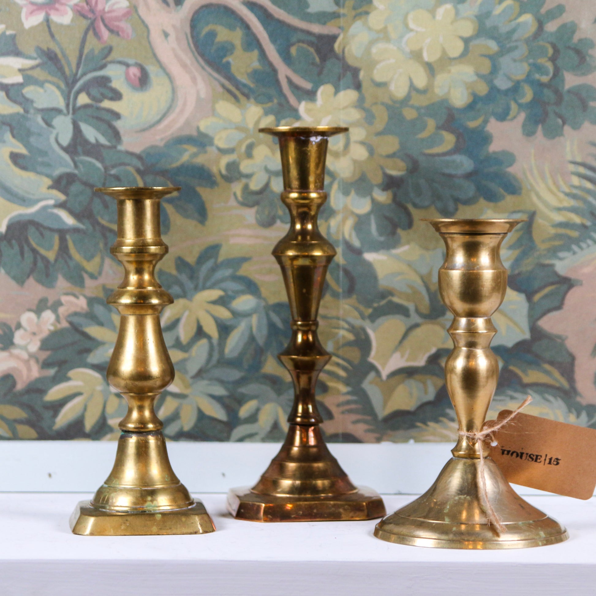 Three brass candlesticks in staggered heights for effortless, elegant styling. Measure 6, 6.5, and 8 inches.