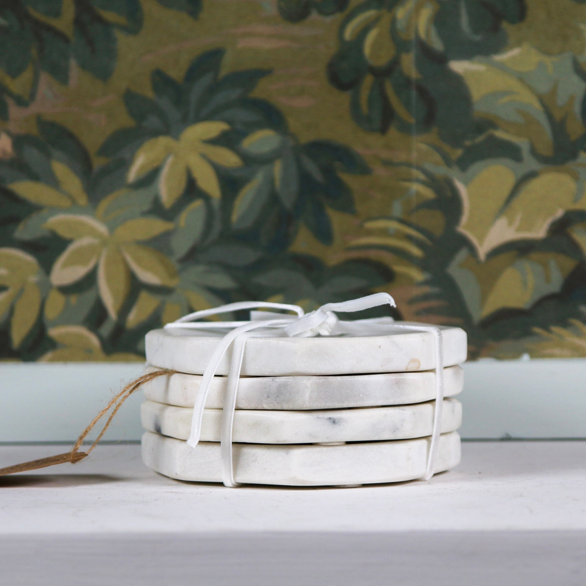 Cool, natural marble coasters that protect your surfaces with style. Each piece unique. 4-inch