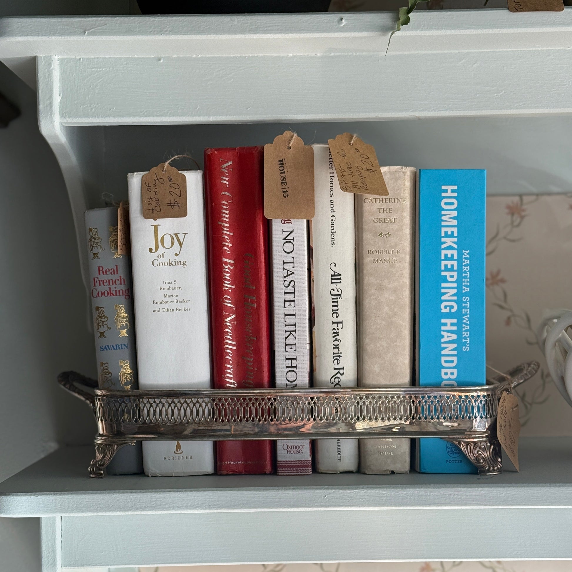 A charming metal holder designed for casserole dishes, combining utility with vintage appeal. Perfect for serving family meals or displaying cook books. Measures 3x17 inches.