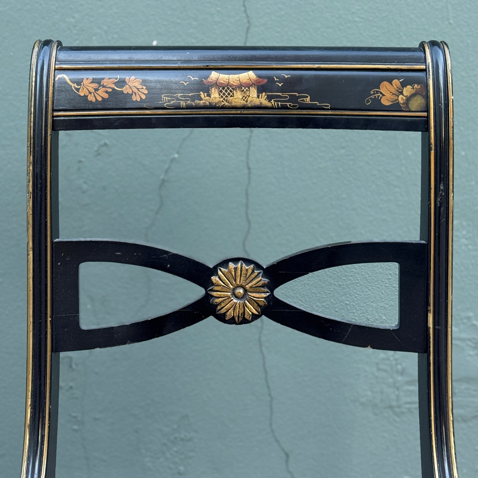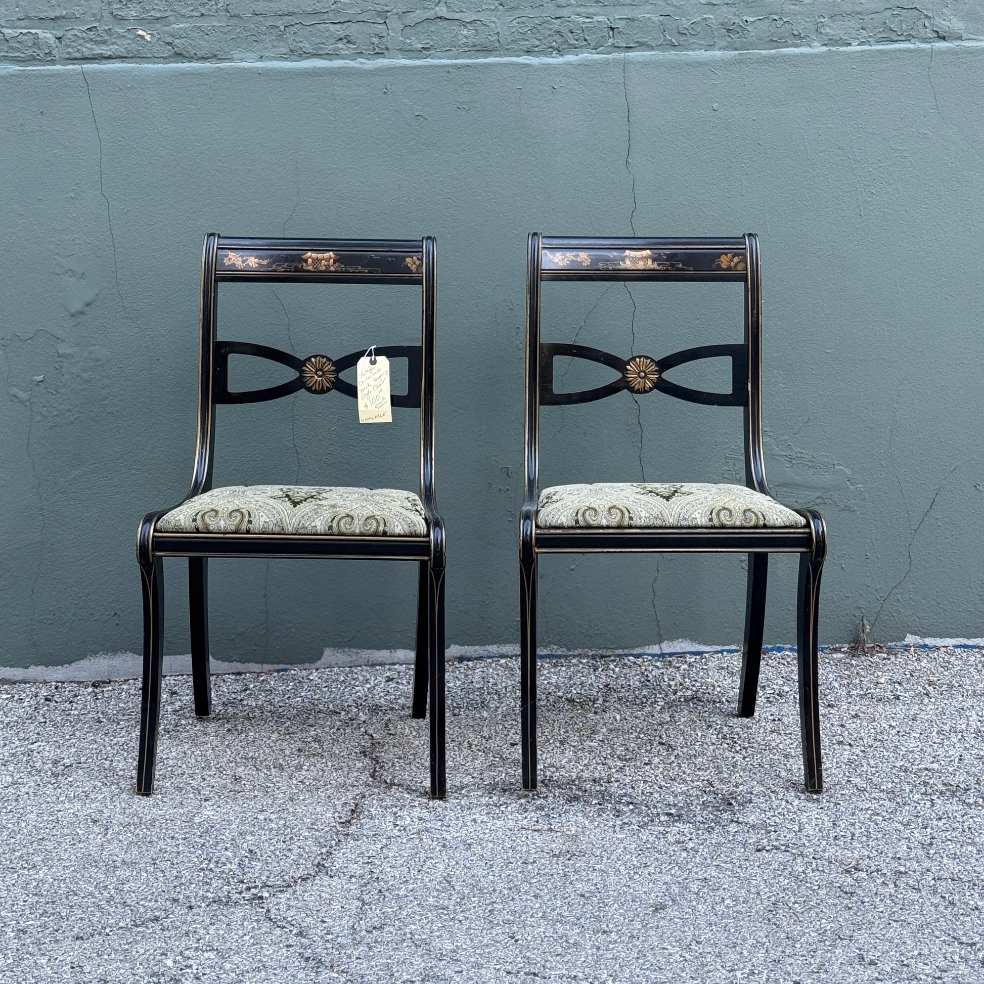 4 available. Hand painted gold details, green paisley fabric. 34 H x 19 D x 17.5" chair height