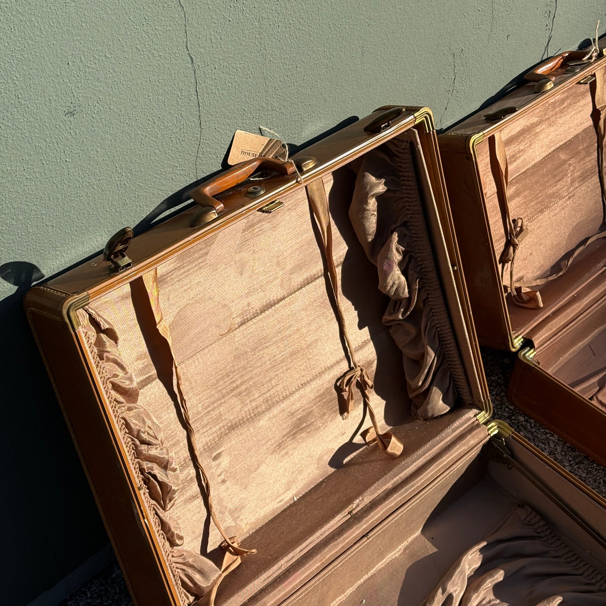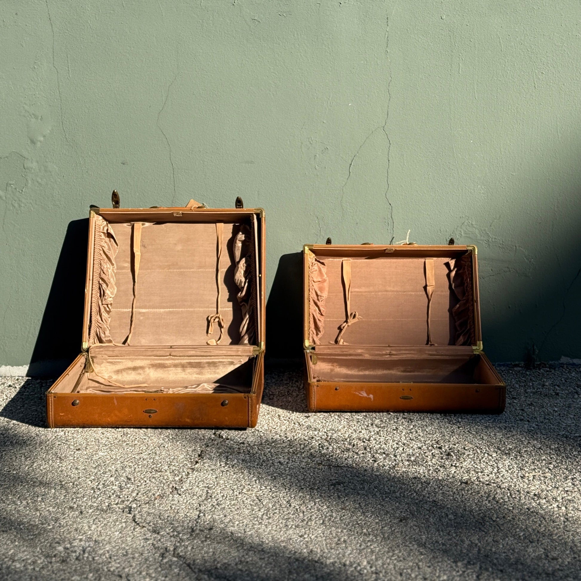 Classic leather suitcases with rich patina and sturdy brass hardware. Perfect for styling under a console, storing linens, or as travel-inspired décor. Two available: Large: 17x21x9 inches and Medium: 13x21x7 inches.