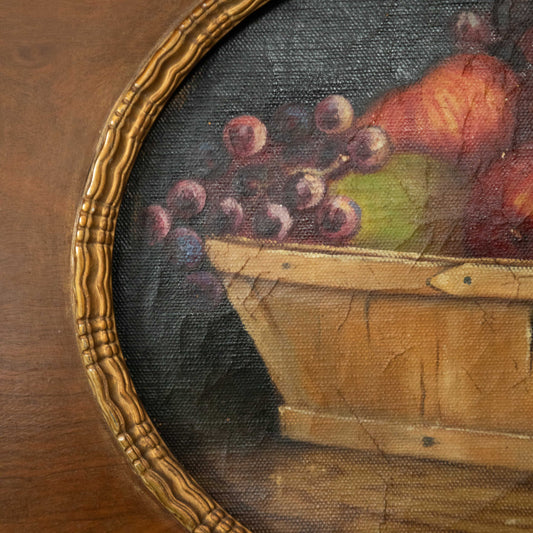 “Golden Orchard” Antique Fruit Basket Still Life, Large Wood Frame