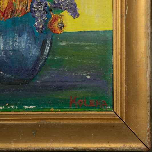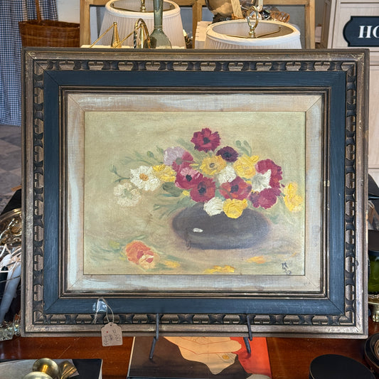 “Blue Mum Still Life” Vintage Oil Board Painting, Vase of Blue Flowers and Mums, Framed